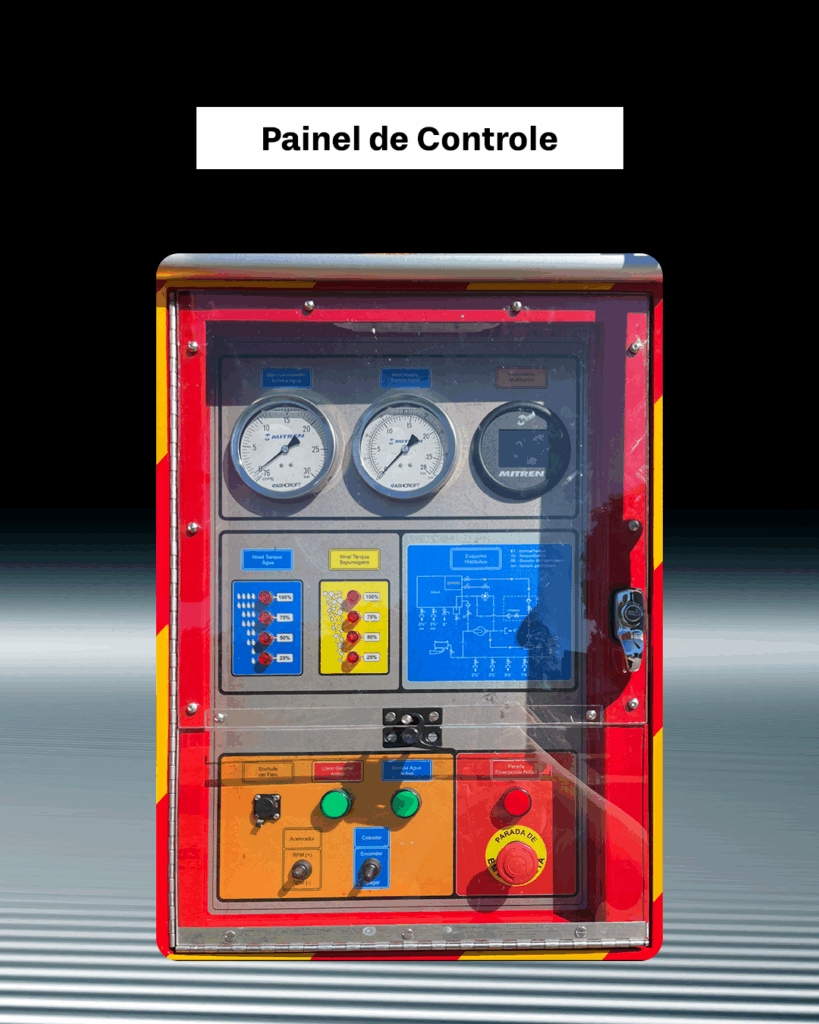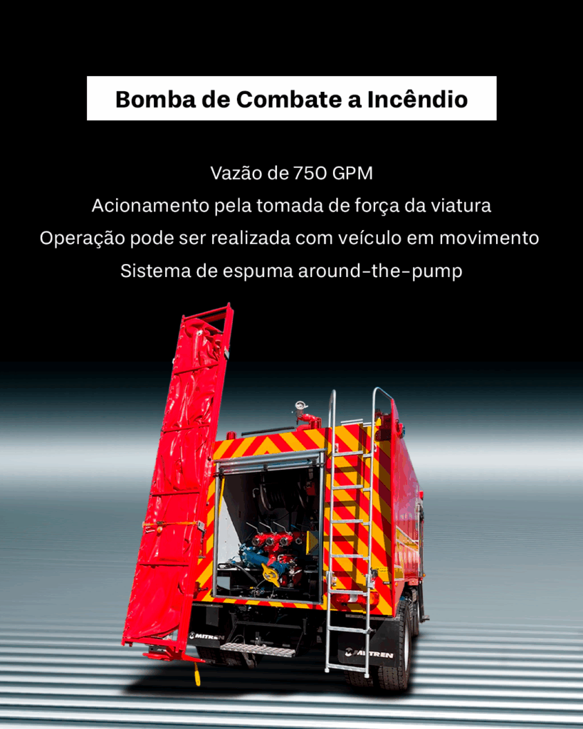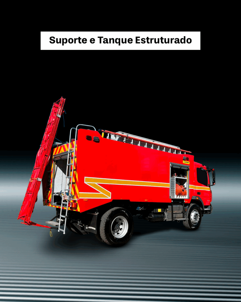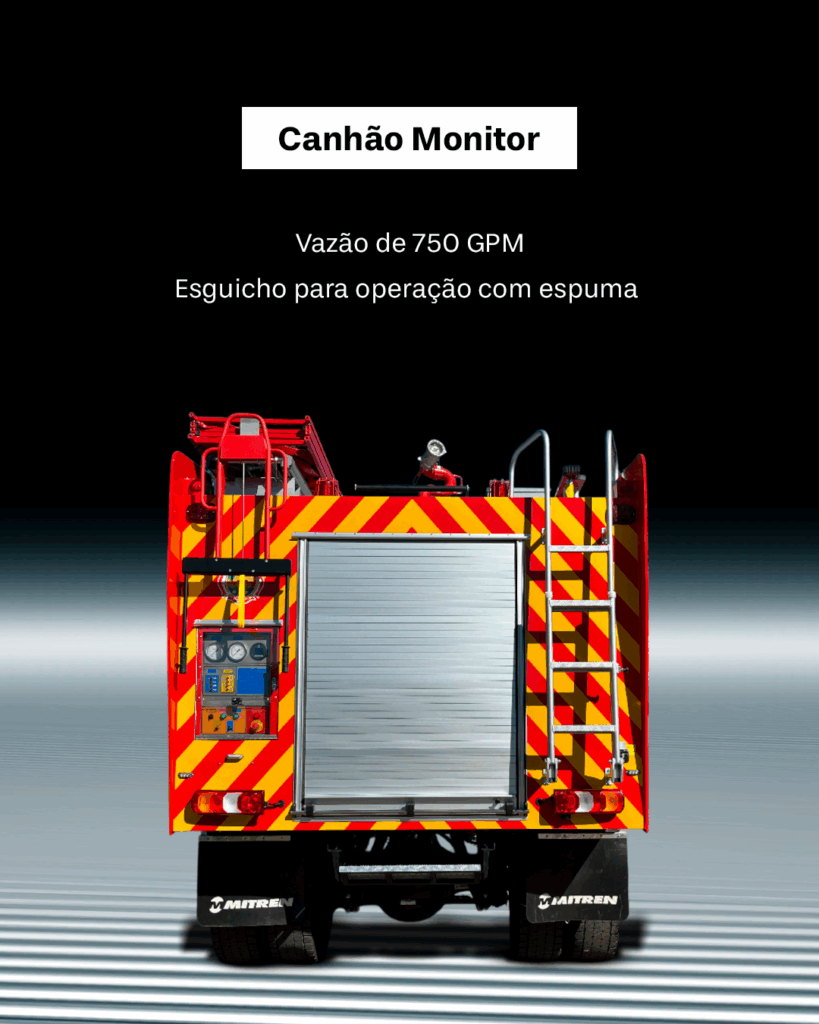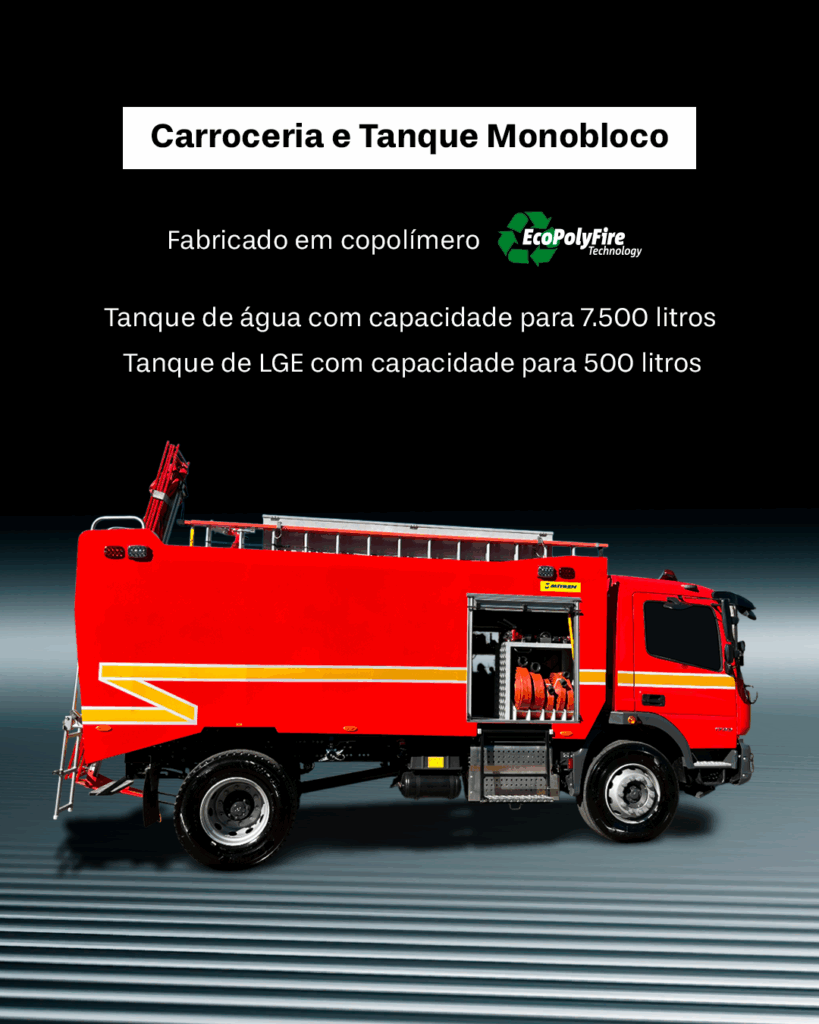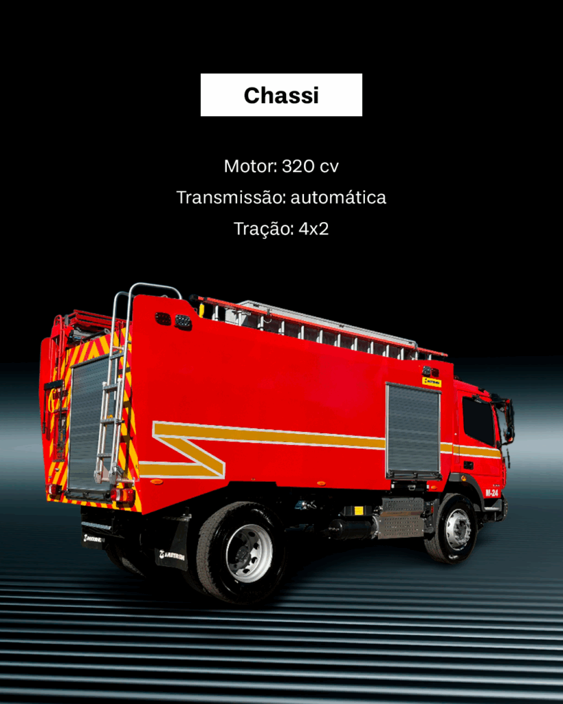 Viatura equipada com tanque de água com capacidade para 7.500 litros, tanque de LGE com capacidade para 500 litros e canhão monitor com vazão de 750 GPM.
