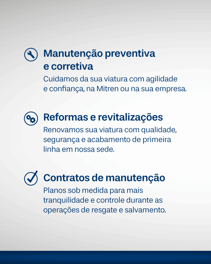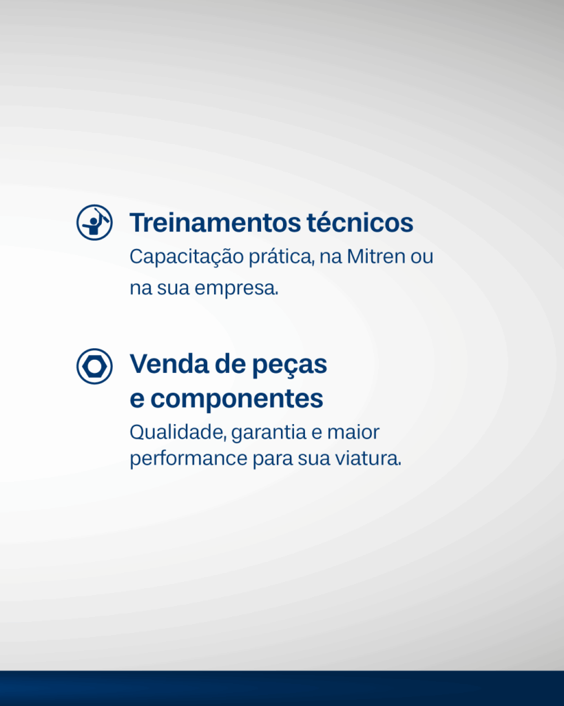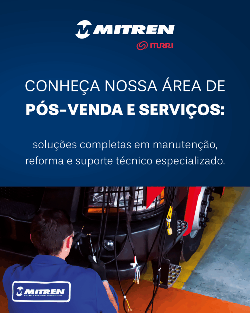 Na Mitren, cada uma das nossas soluções em Pós-vendas e Serviços foi pensada para garantir o máximo desempenho da sua viatura. Com experiência, qualidade e dedicação, oferecemos um atendimento completo — da manutenção à capacitação da sua equipe — sempre com o padrão de excelência Mitren que você conhece e confia.