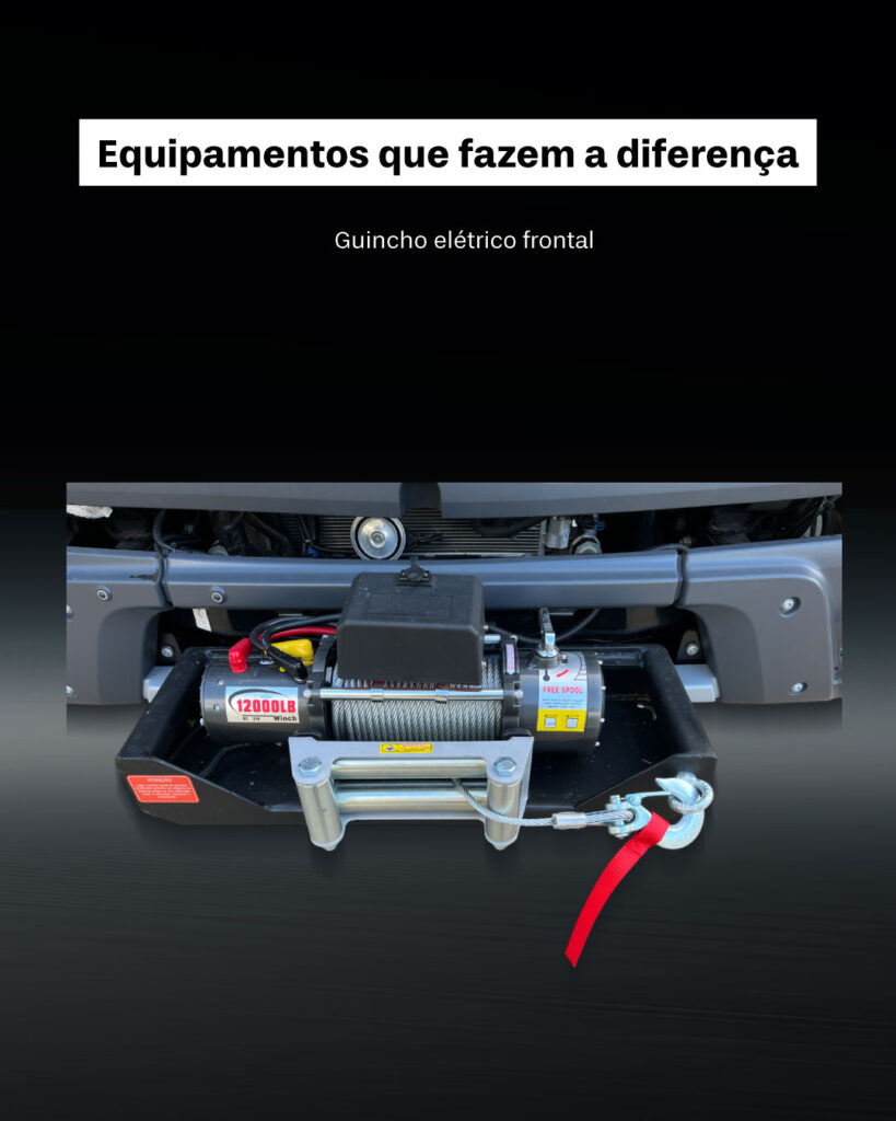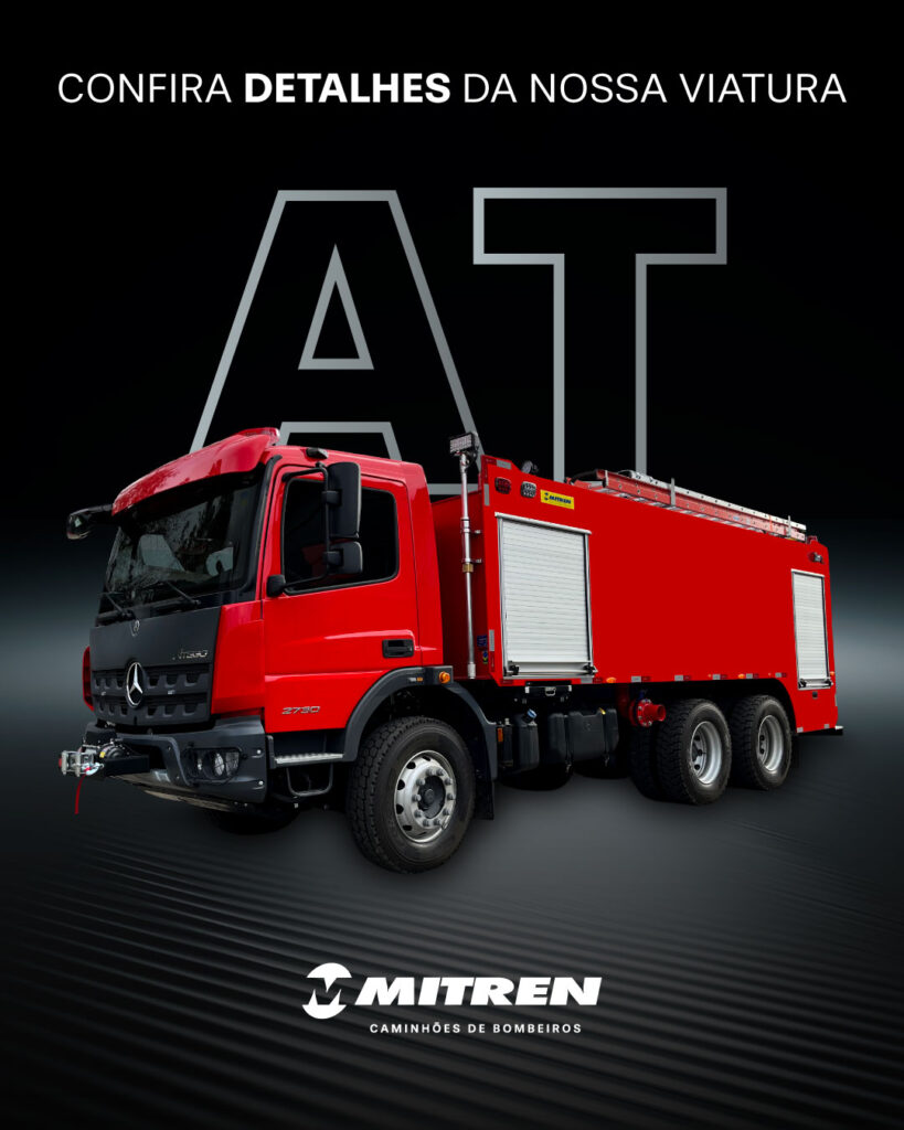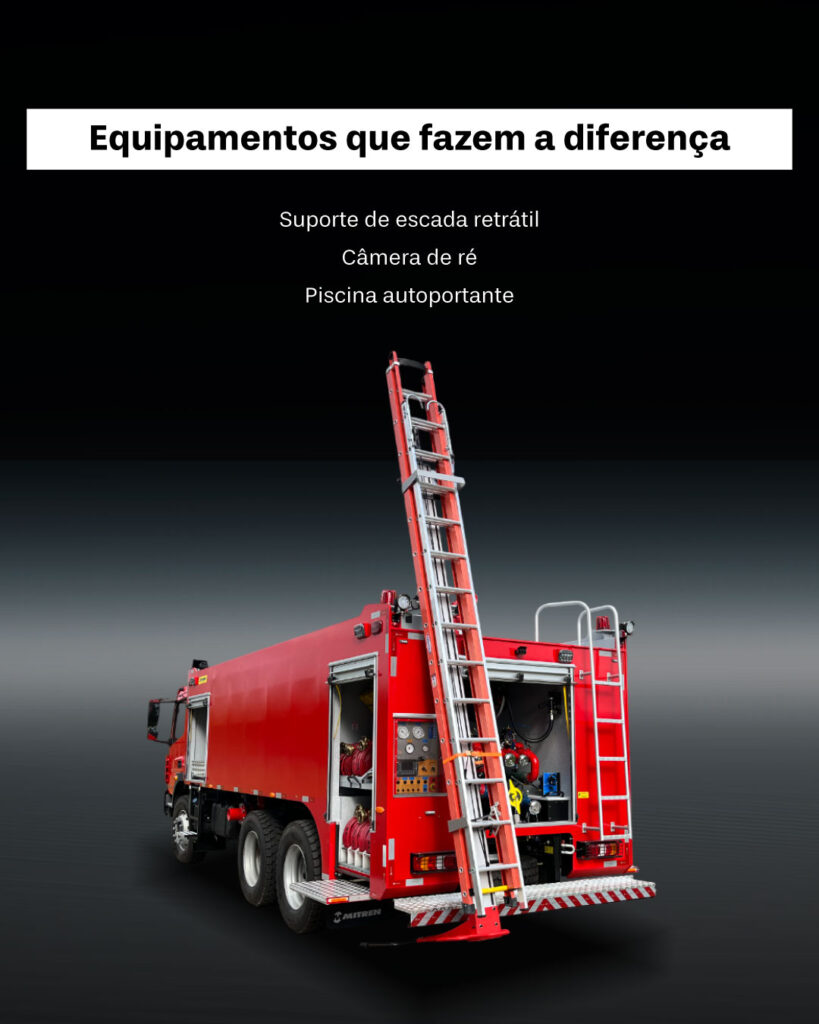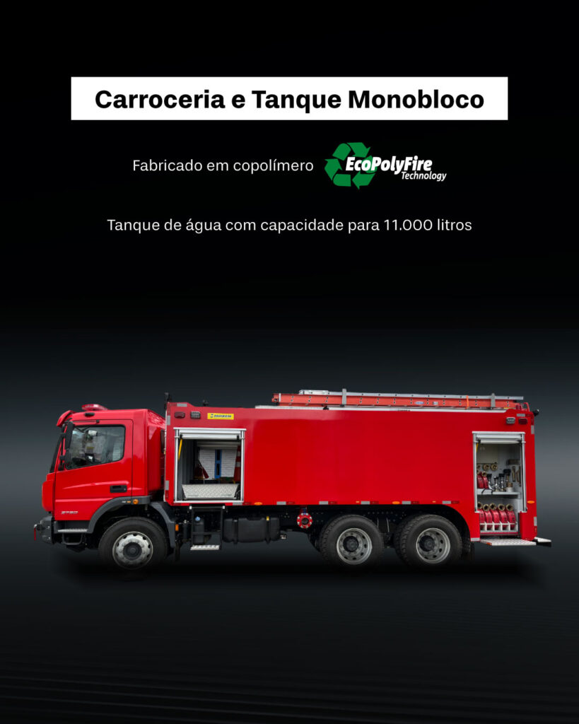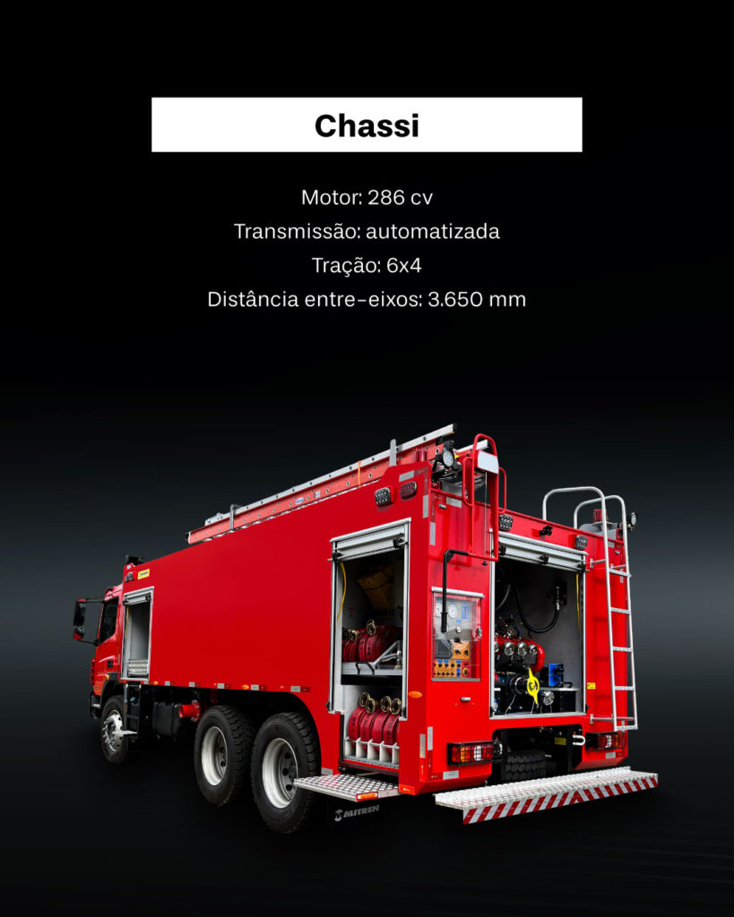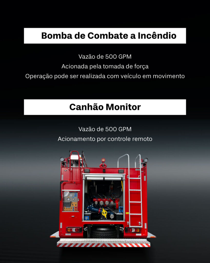 Viatura de combate a grandes incêndios, equipada com tanque de água com capacidade para 11.000 litros e bomba de combate a incêndio com vazão de 500 GPM, acionada pela tomada de força. A operação pode ser realizada com o veículo em movimento.