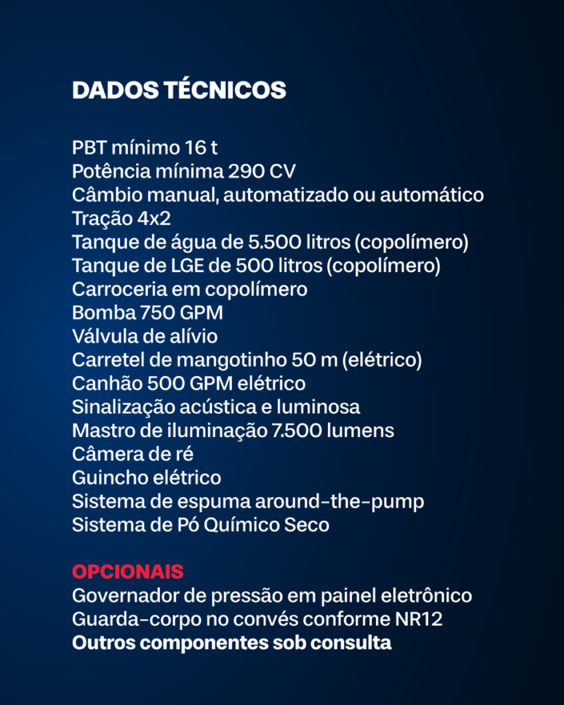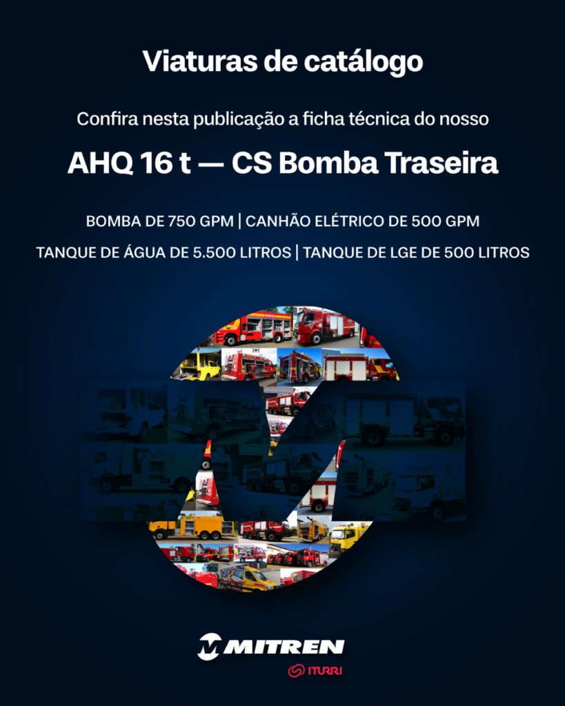 Hoje, destacamos a viatura AHQ 16 t – Auto Hidro Químico, cabine simples, com bomba traseira, tanque de água de 5.500 litros, tanque de LGE de 500 litros, tração 4×2, potência mínima de 290 CV, bomba de 750 GPM e canhão elétrico. É versátil e ideal para atender diferentes demandas de combate a incêndio.
