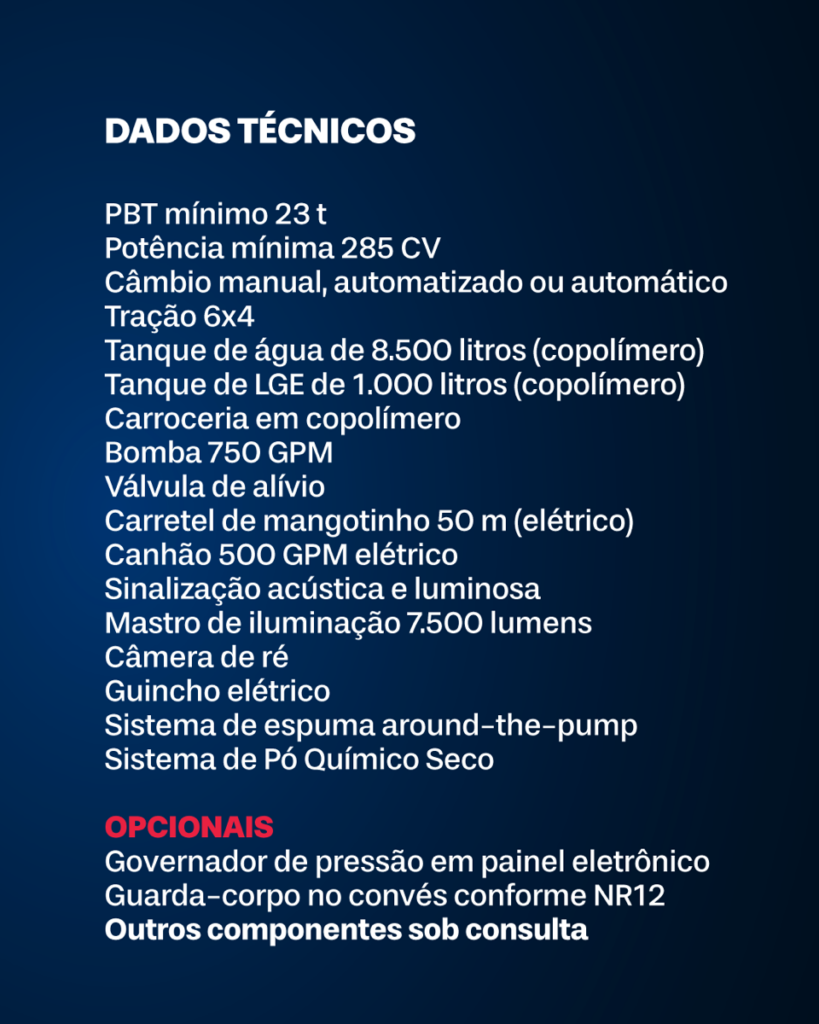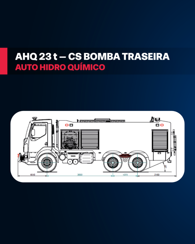 Conheça a viatura AHQ 23 t – Auto Hidro Químico, cabine simples, com bomba traseira, tanque de água de 8.500 litros, tanque de LGE de 1.000 litros, tração 6×4, potência mínima de 285 CV, bomba de 750 GPM e canhão elétrico. Apresenta alta capacidade, preparada para operar com eficiência em cenários de maior demanda.